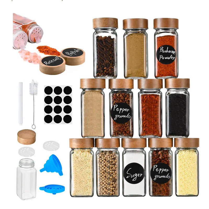 Incluye 12 recipientes cuadrados para especias de cocina, viene con 12 tamices para especias (1 modelo), 12 etiquetas para marcar alimentos almacenados, 1 embudo y 1 lapiz.
