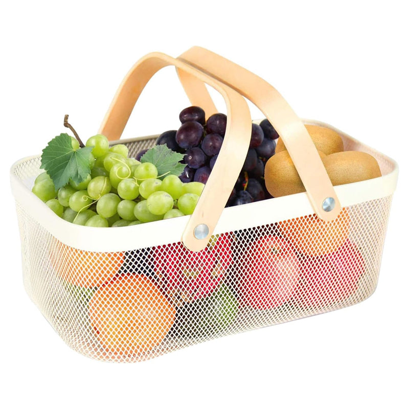 🧺Durable y resistente: Cesta de malla hecha de alambre de metal, la superficie está chapada en plata para prevenir el óxido. Las cestas de jardín para recoger verduras son transpirables y sólidas y no se rompen ni deforman fácilmente. Las asas de madera están firmemente fijadas en ambos lados de las cestas de verduras para cocina, suaves y cómodas.