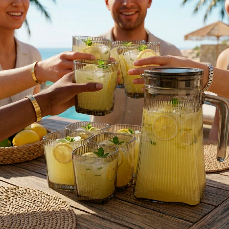 Este set incluye seis vasos copas de vidrio que complementan a la perfección la jarra, creando una experiencia de servicio armoniosa y atractiva.