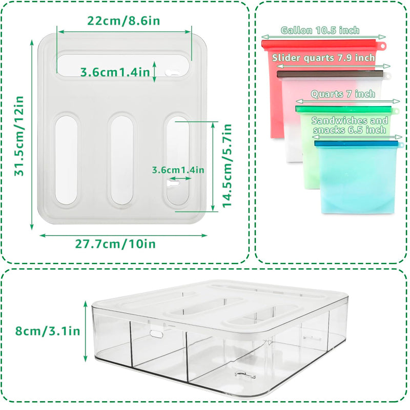 Las dimensiones del organizador con cierre hermético son 31,5 x 27,8 x 8,2 cm. Admite bolsas autosellantes de varios tamaños para un almacenamiento eficiente y ahorro de espacio en cajones y armarios.