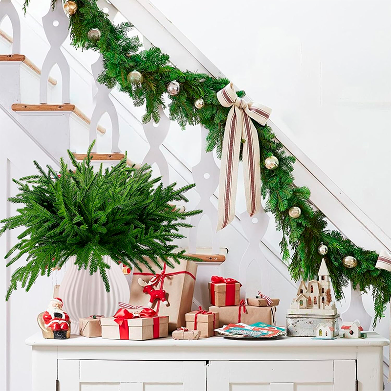 - Las ramas de pino artificial tienen una excelente impermeabilidad, lo que les permite permanecer intactas en diversas condiciones climáticas sin decoloración, deformación o deterioro.