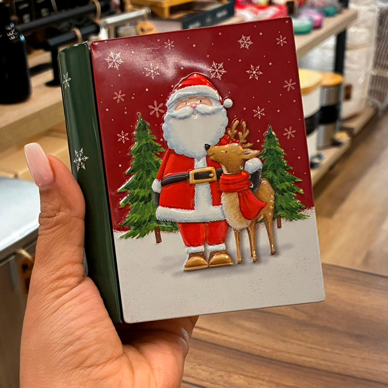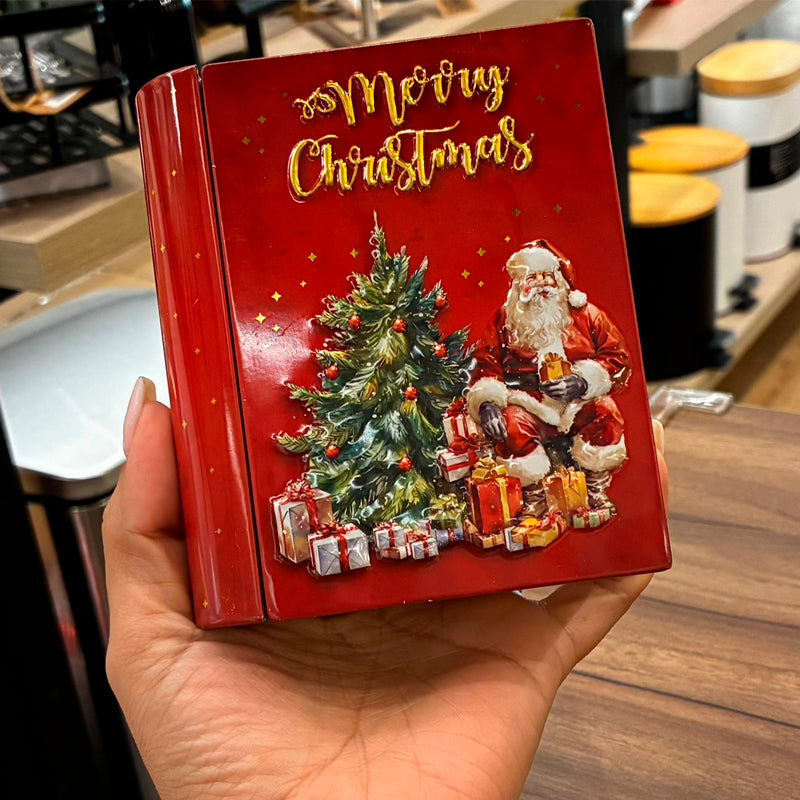 Una preciosa caja metálica navideña con una imagen temática donde puedes guardar una moneda o una grata sorpresa.