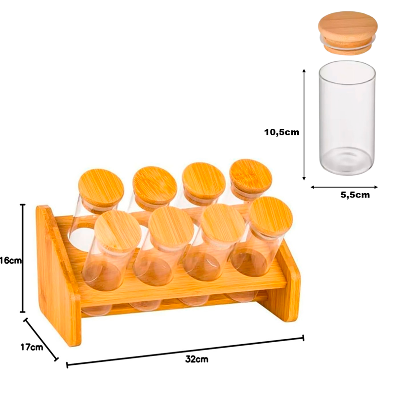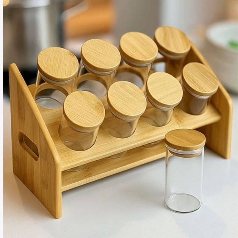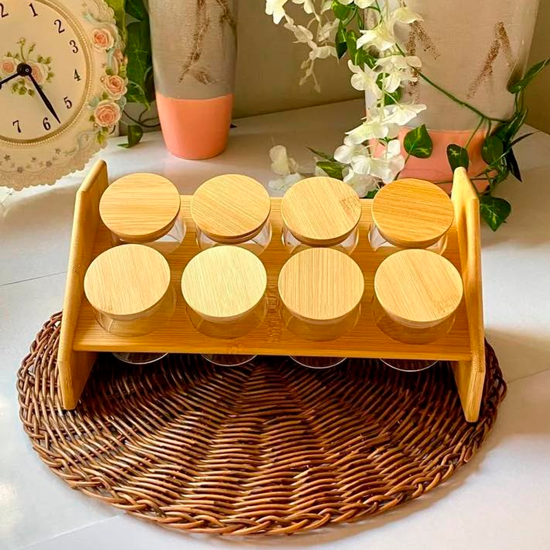 - Con este especiero de bambu, tendrás acceso cómodo a todas tus especias, que estarán perfectamente guardadas. Además, incluye 8 frascos de especias circulares vacíos de vidrio con tapa de bambu.